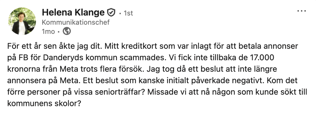 Helena Klange, a public sector communications professional, experienced this contradiction firsthand. After being scammed out of 17,000 SEK through Meta's advertising platform, she stopped all paid advertising on Meta.
